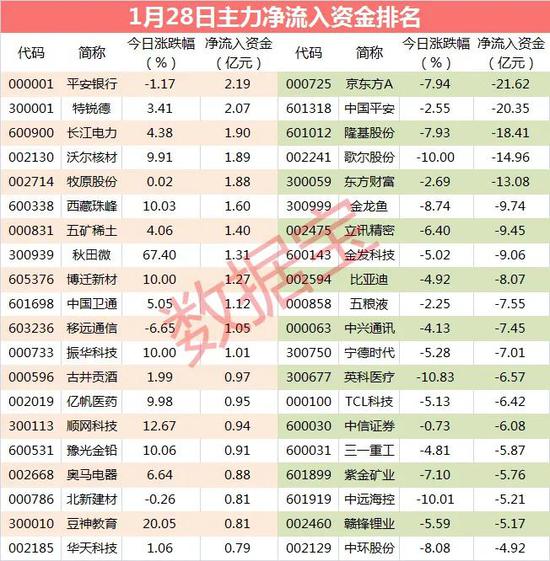 沪指1月28日跌1.91%,主力资金全天净流出708.45亿元。其中,中小板主力资金净流出159.72亿元,创业板主力资金净流出126.73亿元,沪深300成份股主力资金净流出391.72亿元。