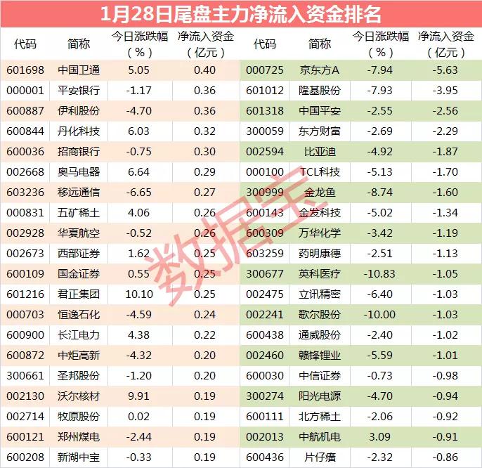从个股尾盘资金流向数据看,有5股尾盘净流入资金超过3000万元,中国卫通、平安银行、伊利股份等个股尾盘资金净流入金额最多,分别高达0.4亿元、0.36亿元、0.36亿元;京东方A、隆基股份、中国平安等个股尾盘资金净流出金额最多。