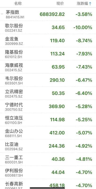 从个股来看,各种“茅”明星股全线下跌,歌尔股份报收跌停,金龙鱼、隆基股份、海康威视、韦尔股份、立讯精密、宁德时代等白马股均跌超5%。