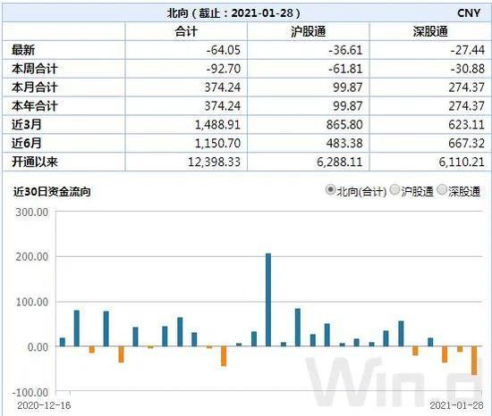 北上资金全天净流出64.04亿元,其中,沪股通净流出36.6亿元,深股通净流出27.44亿元。
