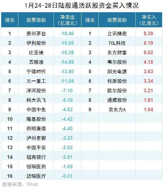 Wind数据进一步统计显示,本周以来,北向资金分别净买入立讯精密、TCL科技等9只个股,净卖出贵州茅台、伊利股份等16只个股。