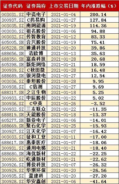 牛眼君(每经牛眼:njcjnews)根据Wind数据统计显示,2021年1月1日至今有31只次新股上市交易,截至目前基本涨跌各半。年内涨幅超过100%的3只,分别是中瓷电子(200.14%)、C药易购(127.84%)和南网能源(114.36%);跌幅居前的分别是华安鑫创(-41.64%)、盈建科(-27.20%)、华骐环保(-26.56%)。别看领涨次新股涨幅远超过领跌次新股的跌幅,但要知道的是,想当年次新股可是上市后能连拉几十个一字涨停板、绝不会亏钱的货!
