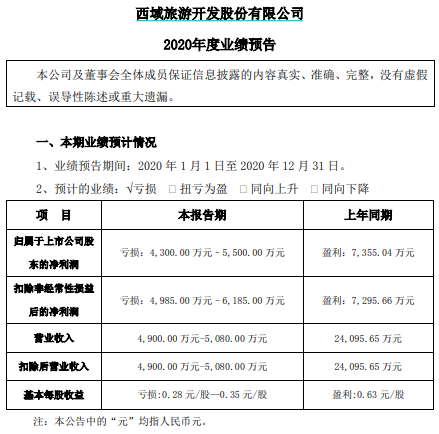 据西域旅游当日披露,预计公司2020年由盈转亏,归属于上市公司股东的净亏损为4300万元至5500万元。公司上年同期盈利7355.04万元。