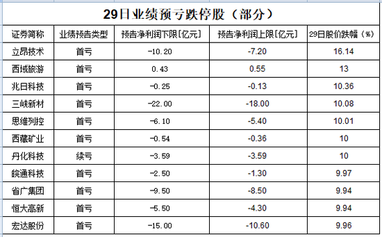据上证报资讯不完全统计,在1月29日披露业绩预亏的公司中,当日股价跌停(不包括ST股)或跌幅超过10%的有11家。