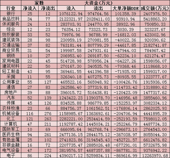 从资金层面看,周五,A股大单资金整体净流出531.37亿元,其中,有1127只个股呈现资金净流入,2942只个股呈现资金净流出。从申万一级的28个行业来看,有4个行业实现资金净流入态势,其中,银行、食品饮料喝休闲服务等三行业资金净流入均超亿元,分别为10.14亿元、9.39亿元和3.89亿元,合计达23.42亿元。另外,24个行业呈现大单资金净流出态势,其中,电子、电气设备、非银金融等三行业净流出资金均超60亿元。