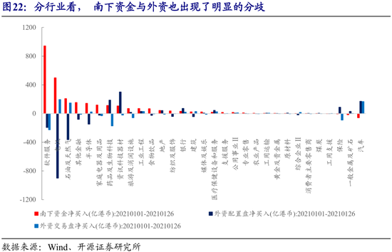 2021年1月以来南下资金与外资的交易行为出现了明显的分歧:南下资金加速净流入港股,外资配置/交易型资金则逐步卖出港股通标的。同时分行业来看,2021年1月以来南下资金主要净买入软件服务、电讯、石油及天然气、其他金融以及半导体等行业,外资配置型资金与南下资金在上述行业的分歧较大,均选择卖出,外资交易型资金同样净卖出软件服务板块。