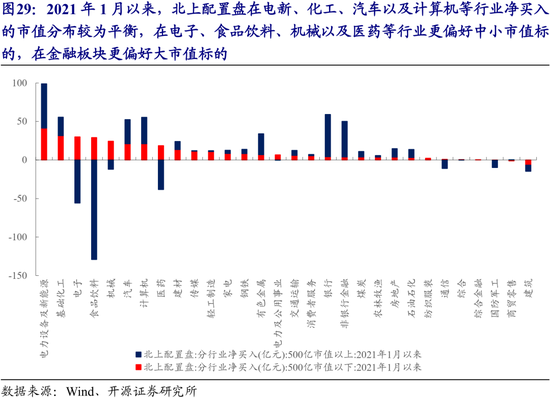 从大小市值的偏好来看,外资明显出现了扩散行为:外资配置盘和交易盘均在增配中小市值的标的。具体而言,1月下旬以来,外资配置盘主要净买入A股中市值在200亿至500亿,以及200亿以下的标的;外资交易盘主要净买入A股中市值在500亿至1000亿以及200亿至500亿的标的;北上配置盘在电新、化工、汽车以及计算机等行业净买入的市值分布较为平衡,在电子、食品饮料、机械以及医药等行业更偏好中小市值标的,在金融板块更偏好大市值标的。