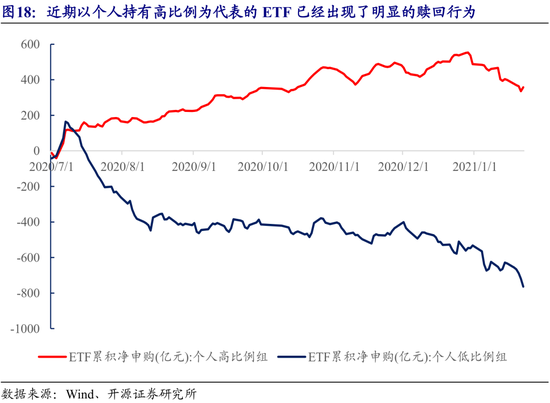 一方面近期以个人持有高比例为代表的ETF已经出现了明显的赎回行为。我们在此前的报告中曾提到可以用个人持有占比较高的股票型ETF申赎情况反映股票型基金的申购赎回行为,我们发现1月以来个人持有比例占比较高的ETF出现了明显的持续净赎回。