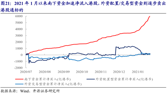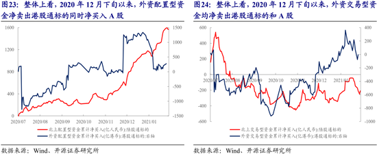 整体上看,2020年12月下旬以来,外资配置型资金净卖出港股通标的同时净买入A股,而交易型资金则无差别抛售。