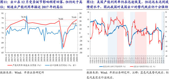 经济复苏的节奏改变但方向并未改变。我国12月出口增速和制造业投资增速稍有回落,但仍处在高位,未来在疫苗的不断普及下,仍有进一步的上行动力。从2020年7月份以来我国出口便表现出了较高的景气度,与制造业形成了有益的循环。回顾2016-2017年的经济复苏阶段,我国出口和制造业投资在2017年末达到了历史高位,当前制造业产能利用率也回升至那时的同等水平,出口也快速反弹;而当下相比于2016-2017年存在更多的机会:全球的财政刺激政策还在酝酿阶段、疫苗还未充分普及,仅仅在以色列、阿联酋、英国推进较快。就目前来看我国对美出口的替代效应仍十分强劲,而如果未来主要经济体疫情控制得当,疫苗接种速度加快,即便其他产出国的产能逐步恢复,但由于财政刺激政策的落地,全球经济的需求外溢效应仍在,我国出口仍有上升空间。从海外来看,目前美国仍处于补库存的阶段,虽然节奏有所放缓,但方向仍在向上;而从美国房地产新屋销售以及成屋的月度供给情况来看,仍处于向上的景气区间。