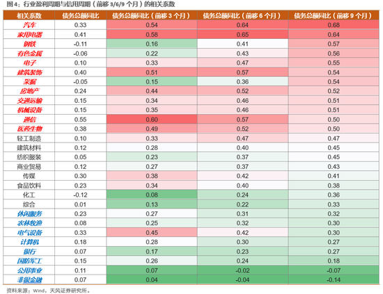 (2)而银行、非银、公用事业、军工、计算机、电气设备、农业、休闲服务、食品饮料等行业,相较之下,受信用周期的驱动较弱。信用周期对行业盈利的影响,核心在于全社会加杠杆的方向,以往地产、基建常作为经济撬动的点,因此产业链的盈利也随着信用周期而波动。而对于科技、消费等弱周期行业,盈利可能还受自身产业周期等影响,因此,表现出的相关性较弱。