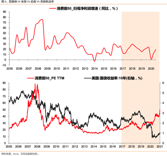 第二类是ROE稳定性强的核心资产,这类公司的业绩受信用周期波动较小,即所谓的核心资产(行业衰退时,仍然能维持较高的ROE)。这些公司属于全球定价,估值也不单纯取决于国内的剩余流动性,更多是与全球流动性挂钩。