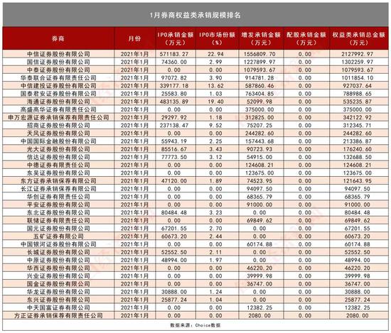 具体而言,中信证券今年1月在首发、再融资领域都有斩获,以21.28亿元的权益类融资金额排名行业第一。