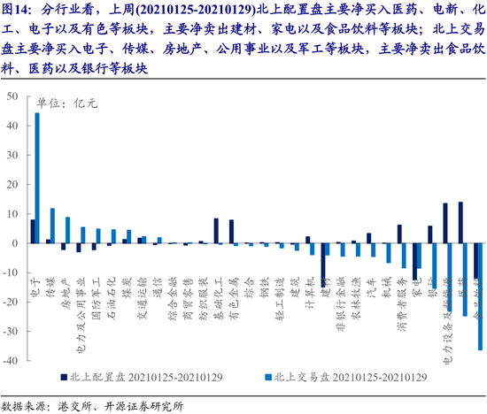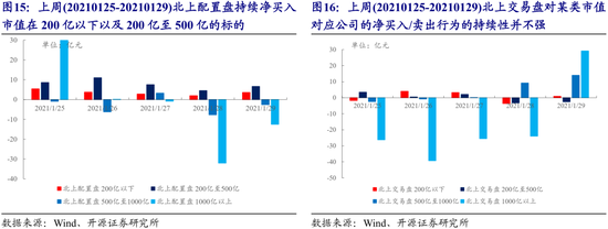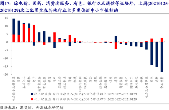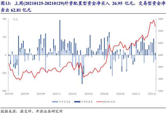 上周(20210125-20210129)北上配置盘净买入,交易盘净卖出,两类投资者分歧较大。上周外资配置型资金净买入 26.95 亿元,交易型资金净卖出 62.81 亿元。行业上,北上配置型资金与交易型资金的分歧较大,共识在于净卖出食品饮料、家电以及建材等行业,同时净买入电子、传媒、煤炭以及交运等行业。同时我们看到:上周北上配置盘在逐步挖掘化工、TMT(除通信)、汽车、机械、食品饮料以及家电等板块的中小市值标的。分市值来看,上周北上配置盘持续净买入市值在200 亿以下以及 200 亿至 500 亿的标的,而交易盘对某类市值对应公司的净买入/卖出行为的持续性并不强。通过拆分发现:除电新、医药、消费者服务、有色、银行以及通信等板块外,上周北上配置盘在其他行业大多更偏好中小市值标的。