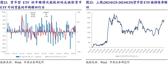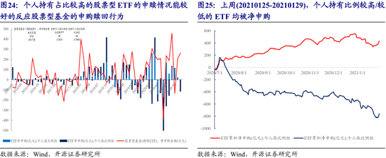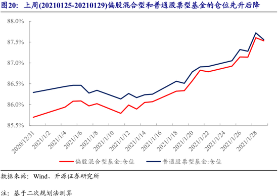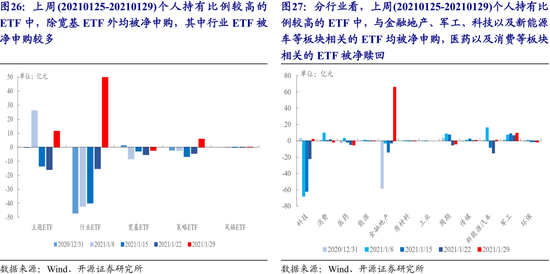 公募仓位先升后降,主要加仓消费与科技板块。上周(20210125-20210129)偏股混合型和普通股票型基金的仓位先升后降,主要加仓消费者服务、食品饮料、家电、军工、电子以及有色等板块,主要减仓农业、商贸零售以及地产等板块。值得一提的是,金融板块均获得一定程度加仓,但幅度相对较小。上周货币型 ETF 被持续净赎回,这意味着上周货币型基金整体可能存在一定的赎回情况,而该类资金可能转化为存款、理财、公募或其他资产。而从个人持有比例较高的 ETF 的申赎行为来看:面临市场的不断调整,上周个人投资者选择“抄底”进场,主要净买入金融地产和军工相关的基金,而医药与消费等板块相关的 ETF 则被净赎回较多。结合前面主动基金在上周的加仓行为来看:消费板块是上周主动基金加仓较多的板块,而个人持有较高的 ETF 中与消费相关的 ETF 在被净赎回。结合北上资金的行为,我们发现公募基金似乎与其主要对手盘(北上)和负债端(个人申购)的价值标准不同,对以食品饮料为代表的消费板块有更坚定的信仰。