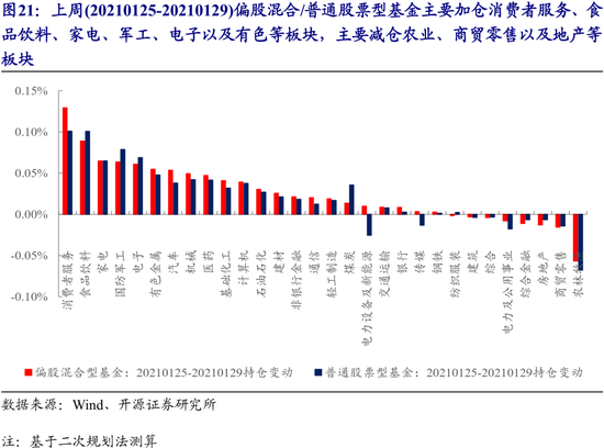 【报告导读】上周(20210125-20210129)北上资金内部存在分歧,但共识在于卖出食品饮料与家电等消费板块,北上配置盘已经在逐步挖掘部分板块的中小市值标的。主动偏股基金上周主要加仓消费板块,而以行业ETF作为代理变量角度显示:个人投资者在选择“抄底”金融地产和军工相关的基金,并卖出消费等板块相关的基金。公募基金似乎与其主要对手盘(北上)和负债端(个人申购)的价值标准不同,对以食品饮料为代表的消费板块有更坚定的信仰。