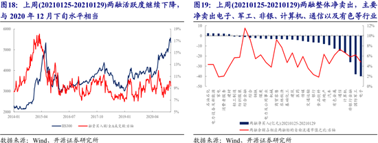 上周(20210125-20210129)两融活跃度继续下降,与 2020 年 12 月下旬水平相当。上周两融投资者整体净卖出约 209.29 亿元,分行业看,主要净卖出电子、军工、非银、计算机、通信以及有色等行业。股票市场开始出现“降杠杆”。