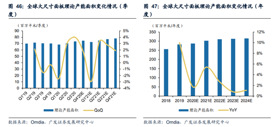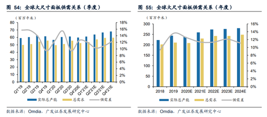 未来行业整体供给增幅温和,21Q1将会出现产能环比下降。在韩厂落后产能退出以及新增产能有限的情况下,未来大尺寸面板整体供给端增幅十分温和。根据Omdia数据,以季度维度来看,1Q21由于三星产能退出,大尺寸整体产能环比下降3%左右,2Q21开始回到环比增长状态,2Q21~4Q21环比增速在2~3%左右。以年度维度来看,2021年大尺寸整体产能同比增幅预计在5%左右,22年增幅仅有3%,23/24年增幅仅有1%。
