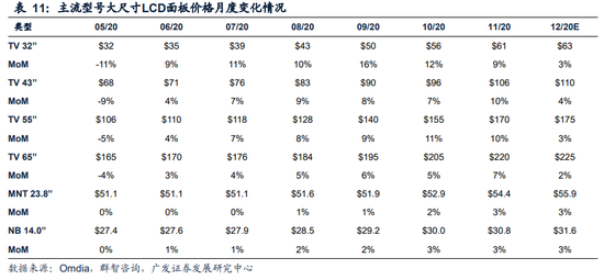 TV LCD面板价格形成一轮史诗级上涨,12月继续向上。由于供需两端的显著错配,根据Omida月度数据,TV面板价格在5月再度触底后,从6月开始反弹,截至11月32/43/55/65寸TV LCD面板价格分别累计上涨达到91%/56%/60%/33%,平均涨幅60%,本轮涨价的幅度和速度均是前所未见。展望12月,根据群智咨询预测,32/43/55/65寸TV LCD面板价格仍将分别上涨2/4/5/5美金,涨幅相比11月明显回落。