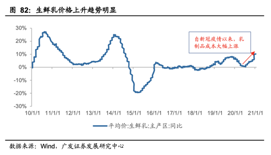 原材料成本压力明显加强,乳制品双寡头盈利能力有望提升。疫情对乳制品影响主要体现在春节送礼需求减少、促销加大——常温酸奶(安慕希、纯甄)和高端白奶(特仑苏、金典)送礼需求占比50%+。伴随疫情恢复,送礼需求回归,行业有望恢复正常增长。根据wind数据,自2020年新冠疫情爆发以来,生鲜乳价格进入上行周期,原材料成本提升有望减缓行业竞争,预计主要体现在买赠促销减少、部分产品直接提价等方面,双寡头(2019年液奶行业CR2达43.13%,伊利和蒙牛市占率分别为22.46%和20.67%,第三名光明市占率4.20%)盈利能力有望提升。