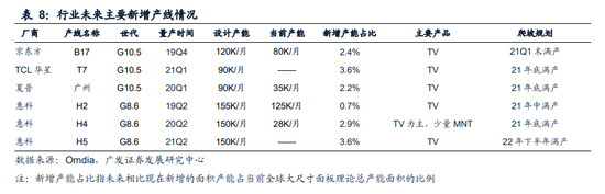 行业新增产能有限,产线爬坡受疫情影响放缓。目前行业主流厂商均已明确不再新规划大尺寸TV LCD产线。从前期已有规划来看,根据Omdia数据,未来能够释放增量的产线主要包括京东方B17、TCL T7、夏普广州线以及惠科的三条产线,整体增量占行业现有大尺寸产能的比例仅有16%左右,与韩厂本地等待退出的落后产能比例相当。整体增量有限的同时,由于疫情影响,机台运输和海外工程师进厂安装调试较为困难,今年京东方的B17产线爬坡进度已经明显延后,我们判断其余产线也将受到不同程度影响,使得行业供给端的增量释放也边际放缓。
