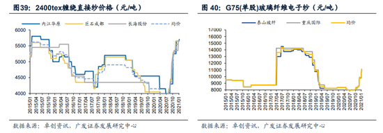 2020年下半年以来玻璃玻纤持续涨价,目前价格高于去年同期。据玻璃信息网,截至2021年1月15日,全国白玻均价2168元/吨,同比去年上涨511元/吨,受到季节因素影响,目前行业逐渐进入淡季,短期现货市场价格走弱,但贸易商和加工企业的社会库存处于极低水平,高价仍有支撑。据卓创资讯统计的中国巨石、内江华原和长海股份价格数据,截至2021年1月15日,2400tex缠绕直接纱均价5667元/吨,同比上涨1517元/吨;G75(单股)玻璃纤维电子纱11100元/吨,同比上涨2750元/吨。