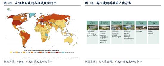 疫情影响海外IDM大厂产能。包括英飞凌、安森美、意法半导体、东芝等在内的欧美日功率器件大厂普遍采用IDM模式,并且普遍是全球范围内分散分布。以英飞凌为代表来看,其功率器件前道晶圆产能主要分布在德国、美国、澳大利亚、马来西亚等地,后道封测产能主要位于东南亚和国内。在全球范围内疫情蔓延环境下,厂区正常运作和设备/物料运输均受到一定影响,目前欧洲和美国疫情仍然严重,我们判断海外IDM大厂的实际产能均在不同程度上受到影响。