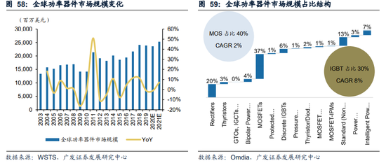 全球功率器件250亿美金市场规模,以IGBT和MOSFET为主,IGBT成长性更强。根据WSTS数据,预计2020年全球功率器件市场规模在236亿美元,2021年预计将同比增长7%达到253亿美元。以细分市场来看,根据Omdia数据,MOSFET和IGBT分别占到功率器件市场规模40%和30%的比重,其中IGBT由于下游更集中于新能源车、风电光伏、高端工控等成长性应用,因此成长性更强。