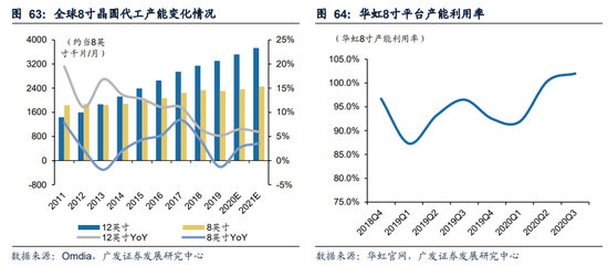 8寸晶圆代工产能紧缺,形成挤出效应。功率器件尤其是IGBT和MOSFET目前以8英寸平台生产为主,除了IDM模式以外,国内和台湾地区均有较多企业采用委外晶圆代工模式。8寸晶圆代工产能在过去几年无明显扩张,当前由于PMIC、驱动IC、CIS、指纹、MCU、功率器件等各类需求的全面畅旺导致普遍的产能满载紧缺,功率器件作为价值量相对较低的产品甚至边际上受到产能端的挤出。以华虹8寸为例来看,其Q2Q3的稼动率均在100%以上,充分反映目前紧张情形。
