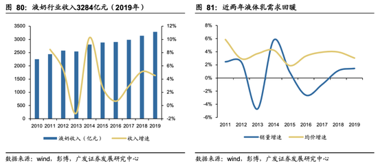 根据wind和彭博数据,2019年乳制品行业(不含婴幼儿奶粉)收入3470.88亿元,预计未来5年收入维持5%左右复合增长。拆分乳制品子行业,95%收入源于液奶,2019年液奶收入3284.24亿元,10-19年复合增长4.28%,量、价复合增长0.61%、3.65%。2015年以来行业销量增速明显下滑主要源于:(1)需求逐渐饱和,行业从高速成长期向成熟期过渡;(2)2014年以来各乳企纷纷提价且升级产品结构,减少低端产品生产,导致部分终端需求流失。2018年以来行业需求回暖,主要受益于消费升级和三四线城市乳制品消费崛起。消费升级和三四线城市消费崛起有望延续,我们预计未来5年(2019年为基数年)液奶收入有望维持5%左右复合增长。