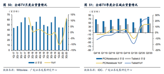 全球疫情带来TV和IT需求爆发。在全球范围内的疫情影响下,居家办公/教育/娱乐以及海外发达国家的消费刺激政策对TV和IT需求带来明显拉动。TV方面,根据Witsview数据,20Q3全球TV品牌出货量同比大幅增长12%,相较于今年上半年的大幅下滑形成深V反转。IT方面,根据IDC数据,20Q2全球PC/Notebook出货量同比大幅增长11%,Q3增速进一步上升至15%,平板电脑(Tablet)也呈现出类似趋势,Q2/Q3出货量同比增速分别为18%和25%。在当前全球疫情仍然严峻的情形下,我们判断未来一到两个季度疫情所带来的TV和IT面板的需求端动能仍将延续。