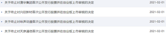 巧合的是,2020年12月1日-2021年2月1日,创业板IPO企业终止审核数量也是25家。特别是在2021年2月1日那天,有4家创业板IPO企业终止审核,它们分别是深圳市澳华集团股份有限公司(下称“澳华集团”)、绍兴兴欣新材料股份有限公司(下称“兴欣新材”)、广东咏声动漫股份有限公司(下称“咏声动漫”)、深圳市天彦通信股份有限公司(下称“天彦通信”)。