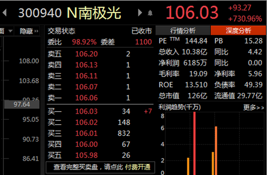 同时,创业板新股N南极光更是羡煞旁人,上市首日涨幅高达730.96%,中一签获利就达到35740元。