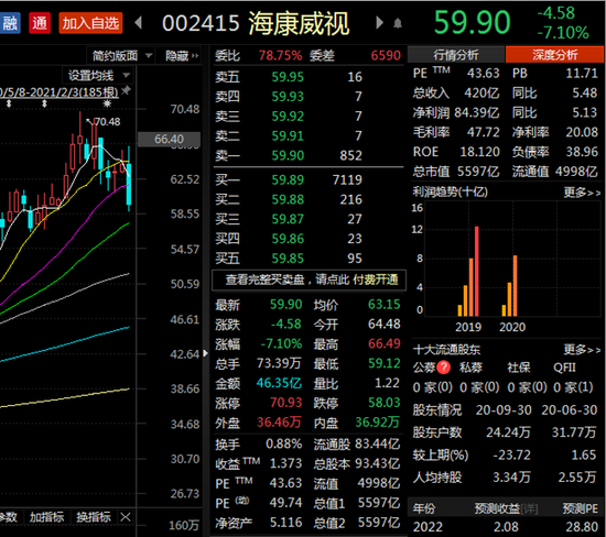 另一只明星股,市值超5000亿的海康威视也突然大跌7.10%,不过其股价在近期刚创出新高。