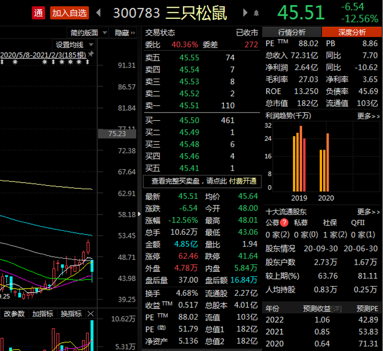 与此同时,却有一波抱团明星股栽了。首先是三只松鼠,它成为2月3日两市跌幅最大的个股,下跌12.56%。