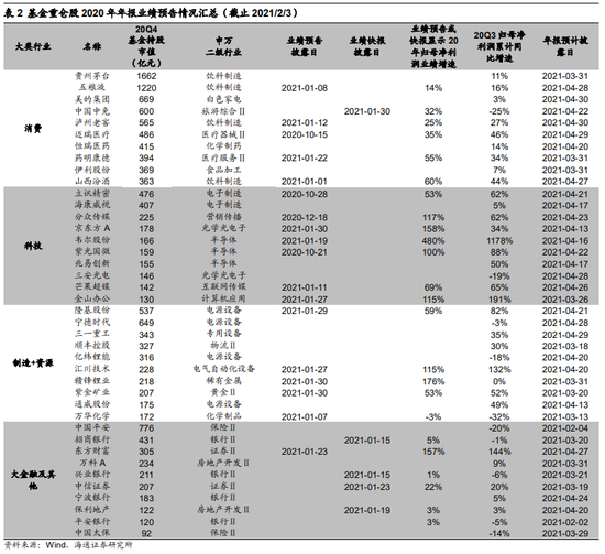 个股层面,我们筛选了四大类行业共40只基金重仓股的业绩,基金重仓股选自20Q4主动偏股型基金的持仓,整体看业绩预告或快报显示20年绝大多数重仓股归母净利润增速均较20Q3有明显的改善,详见下表: