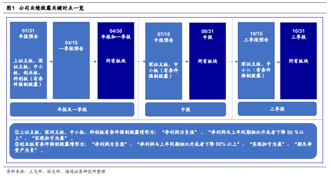 ① 创业板从19年强制披露业绩预告改为20年有条件披露。根据2020年6月12日发布的《深圳证券交易所创业板股票上市规则》,要求创业板公司预计年度经营业绩或者财务状况将出现下列情形之一的,应当在会计年度结束之日起一个月内进行预告:(一)净利润为负;(二)净利润与上年同期相比上升或者下降50%以上;(三)实现扭亏为盈;(四)期末净资产为负。年度业绩预告的披露时间最迟不能晚于1月31日。