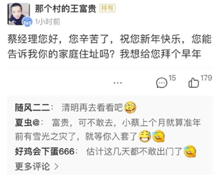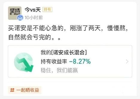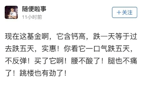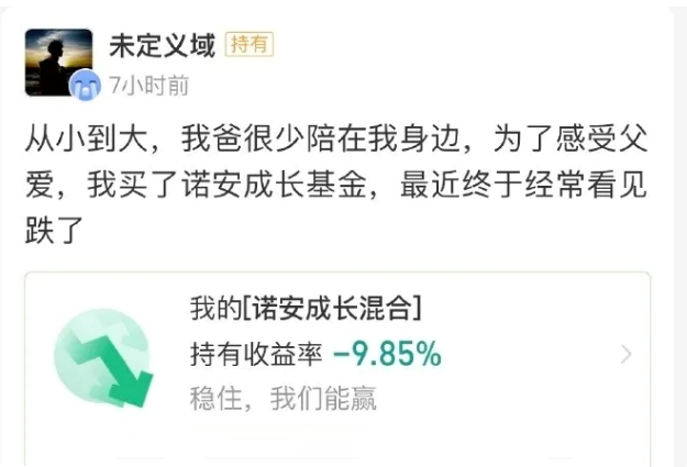 有网友表示,诺安成长基金含钙高,买了它以后腰不酸了、腿不痛了、跳楼也有劲了。有网友玩起了谐音梗,称从小到大自己父亲很少陪在身边,为了感受父爱买了诺安成长基金,最近终于经常看见跌(爹)了。还有网友表示,想直接上蔡经理家给他拜个早年。