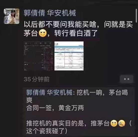 华安证券机械分析师郭倩倩也在朋友圈吐槽,“以后都不要问我能买啥,问就是买茅台,转行看白酒了”,并附赠打油诗一首:挖机一响,茅台喝爽。合同一签,黄金万两。她在朋友圈下放评论称,推挖机的真实目的是,推茅台(这个瓷我碰了)。