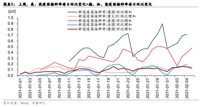 2月第一周,意、德、法等欧盟国家的疫苗接种率环比提升加快,美、英、意等疫苗接种率领先国家的日增病例进一步减少,美元震荡偏强、油价大幅走强、金价进一步走弱、铜价震荡修复,10年期美债利率再度回升至1.1%以上、临近1.2%台阶,10年期欧元区公债利率小幅回升至-0.5%以上、美欧利差走平。我们认为,期间大类资产表现所呈现的市场预期是:欧盟与美国的相对基本面预期差或有所减压,在美元震荡偏强之下,油价大幅走强+铜价震荡修复反映市场对主要经济体疫苗有效性的信心明显提升、通胀预期提升。