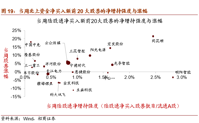 个股方面,北上资金净买入规模最高的为宁德时代,净买入规模39亿元;其他净买入较多的包括长江电力、阳光电源、先导智能等;净卖出规模较高的包括TCL科技、贵州茅台、上海机场、药明康德等。