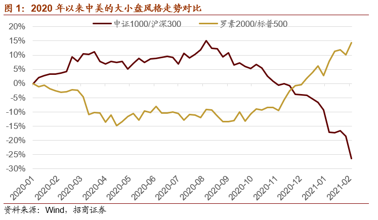 2020年四季度以来,A股和美股的中小市值公司出现了严重背离,A股中小市值公司整体出现大幅调整,而美股中小市值公司却大幅上涨。我们分析了背后的逻辑和原因是因为,美国大小盘风格取决于经济趋势,去年四季度以来美国经济加速改善, 市场对于成长性较高的中小市值公司重回青睐,同时,美国利率中枢开始上移,业绩重要性愈加重要。而疫情中,美国产生了很多新的消费趋势。所以,美股呈现小票占优的特征。反应了经济基本面的改善和流动性的边际趋弱。