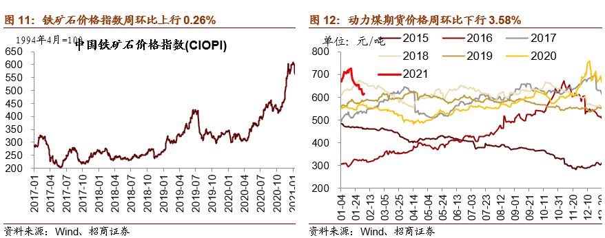 钢坯价格指数下降,铁矿石价格指数上涨;焦炭、焦煤、动力煤等价格均下降。本周钢坯价格指数下降0.15%至3886,螺纹钢价格维持在4357元/吨;铁矿石价格指数上行0.26%至563。近期煤炭等价格持续下降。本周焦炭期货价格周环比下降0.53%至2557.5元/吨;焦煤期货价格周环比下降0.78%至1518.5元/吨;动力煤期货价格周环比下降3.58%至613.8元/吨。