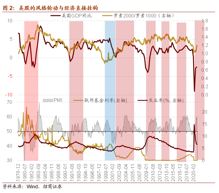 美国从70年代开始,利率不断下台阶,不过前面那张图显示了,美国的大小盘风格是波动的,利率下台阶不代表没有利率的波动。利率上行多半对应经济好,反而是小票相对占优,因为盈利弹性能抵消估值下行,而利率下行多半对应经济差,大盘相对占优。