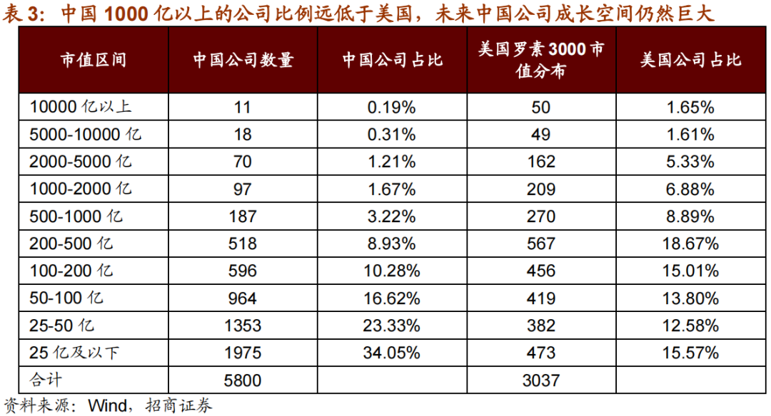 但是第二部分却很少有人提及,那就是,美国1000亿以上公司占比15.5%,共有470家,而中国公司占比3.4%,196家。那么随着中国经济体量的增长,逐渐接近或者超过美国,有大批100~1000亿的公司成长为1000亿以上,而部分100亿以下的公司会成长为200亿以上。