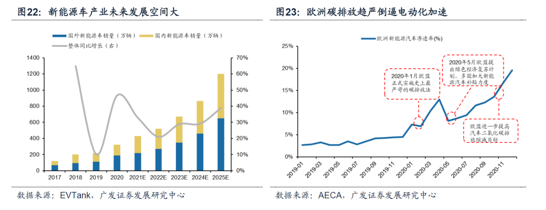 新能源车:碳中和“第一个10年”目标驱动电动化再加速。(1)全球市场共振:欧洲碳排放收紧(将2030年温室气体减排目标由40%提升至60%),政策补贴加码,新能源汽车渗透率持续提升(2020年以来增长超10pct),拜登上台大力支持新能源车产业,海外电动化规划有望带来市场增量。(2)政策驱动:新能源汽车补贴退坡延迟,叠加产业发展规划出台,明确2025年电动化目标20%,以及新双积分政策落地,对新能源车的引导力度持续加大。(3)市场驱动:特斯拉在电动车领域的领先优势持续凸显,鲶鱼效应不断增强,车型梯次布局及价格的下探将推动电动车加速平价化。各车企加速打造新车型爆款创新产品,消费者对新能源车接受度提升,新能源车需求空间有望进一步释放。