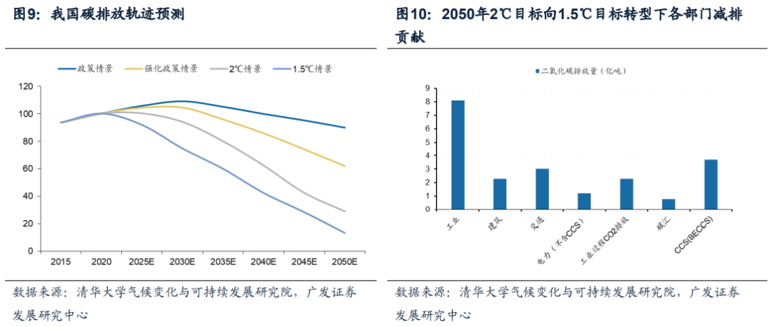 四大碳排放情景分析。根据清华大学气候变化与可持续发展研究院对于“中国低碳发展战略与转型路径研究”的结论:(1)政策情景(落实并延续2030国家自主贡献目标):2030年左右碳达峰,2050年降至约90亿吨;(2)强化政策情景(自下而上强化2030年国家自主贡献目标,不断加大减排力度):2030年前达峰,2050年降至约62亿吨;(3)2℃情景(2050年实现与2℃目标相契合的减排情景):2025年左右达峰,2050年降至约29亿吨,净排放约20亿吨(考虑CCS和森林碳汇);(4)1.5℃情景(2050年实现与1.5℃目标相契合的减排情景):2025年前达峰,2050年降至约12亿吨,基本实现碳净排放(考虑CCS和森林碳汇)。