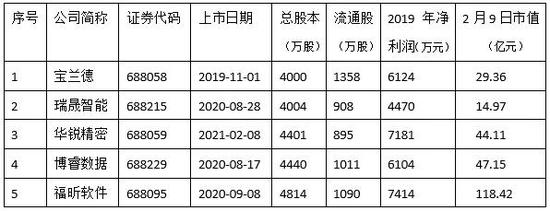 原标题:科创板总股本低于5000万的公司5家,最小股本4000万,流通盘最小的895万