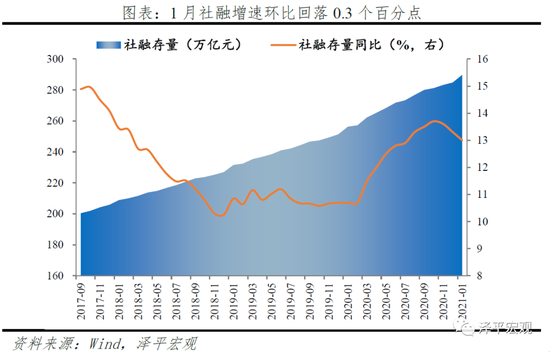 1月社融增速13.0%,环比下降0.3个百分点,信用扩张继续放缓。1月新增社会融资规模5.17万亿元,同比多增1207亿元。存量社融规模289.74万亿元,同比增速13.0%,环比回落0.3个百分点。