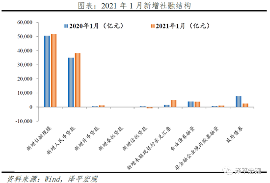 表外融资方面,未贴现汇票带动表外同比多增。1月新增表外融资4151亿元,同比多增2342亿元。未贴现承兑汇票同比大幅多增3499亿元,构成表外主要支撑,出口高增、贸易活动活跃背景下企业开票需求上升。信托贷款同比多减1274亿元,金融监管加强,2021年非标压降压力仍在。但与去年末相比,环比大幅少减3778亿元,主要受益于1月到期量减少、融资类信托整改压力边际减轻。